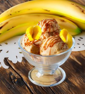 Ledai su kondensuotu pienu, grietinėle ir bananais