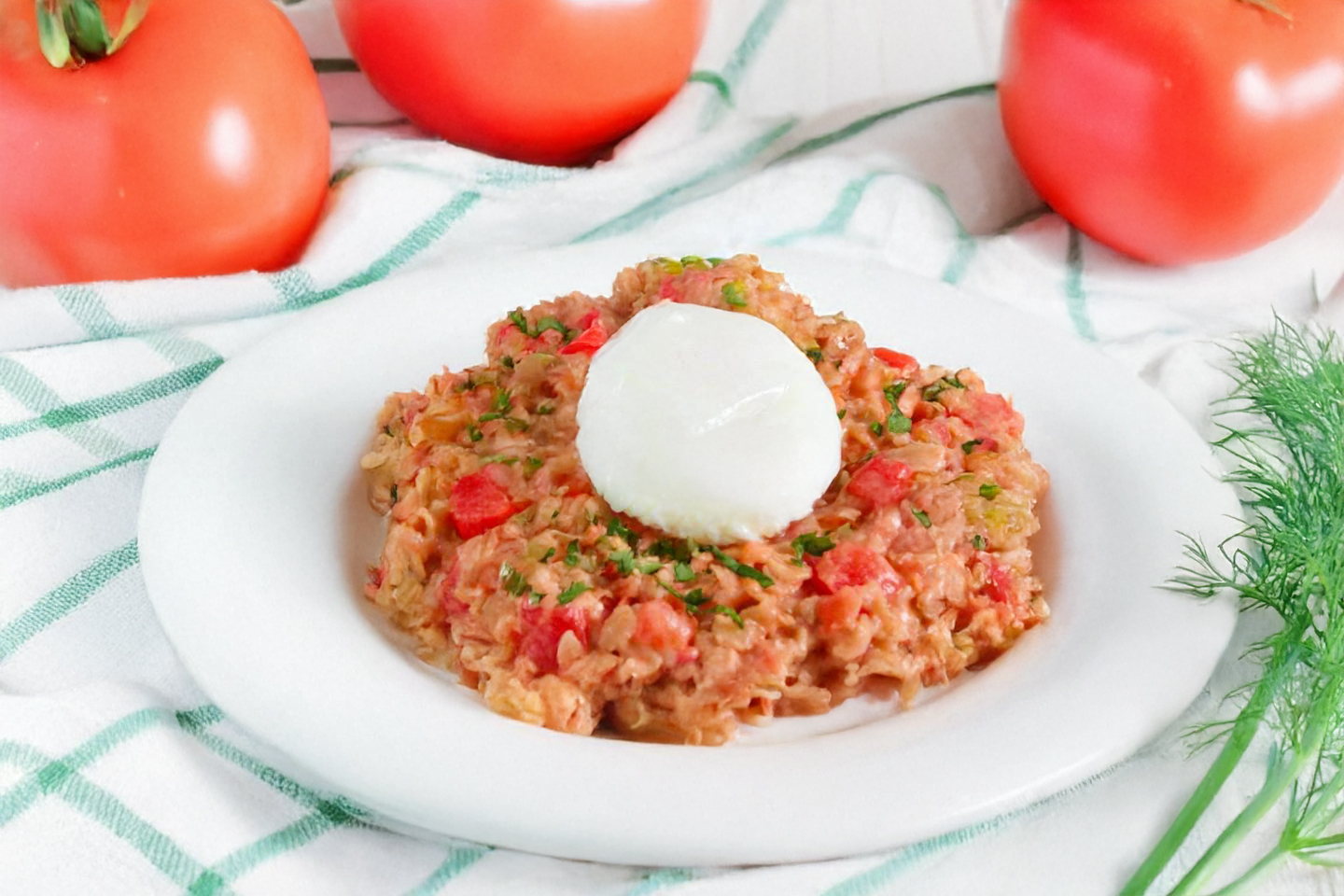 Avižinė košė su pomidorais ir virtu kiaušiniu – sveiki, sūrūs pusryčiai iš avižų, pomidorų ir minkštai virto kiaušinio.