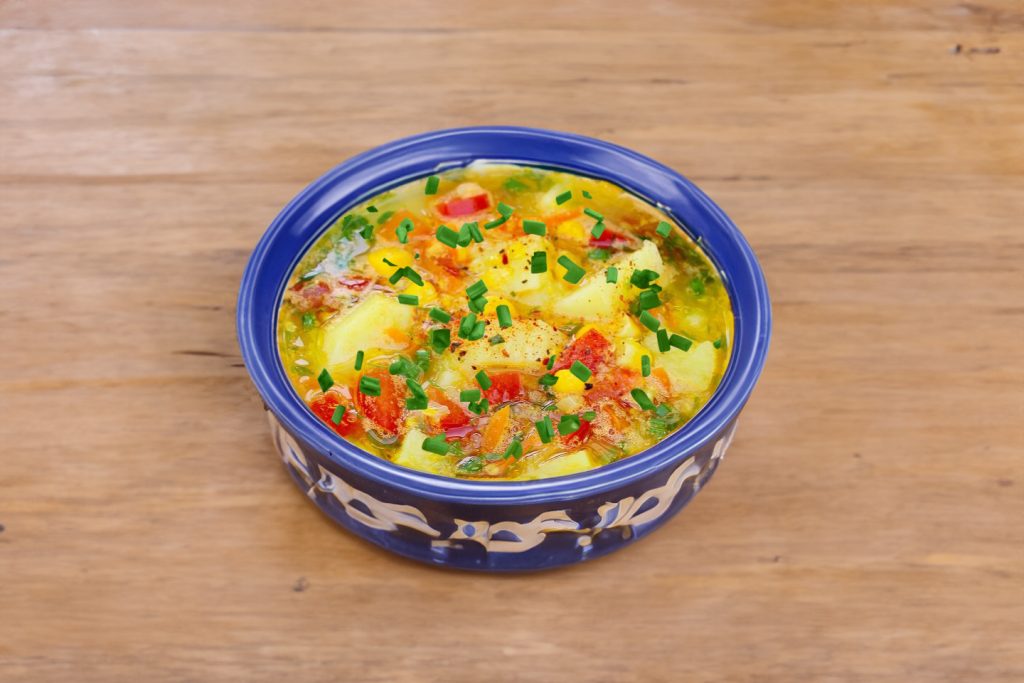 Bulvių sriuba – lengva, soti ir be mėsos! Su bulvėmis, kukurūzais ir daržovėmis. Puikiai tinka kasdieniam ar pasninko meniu.