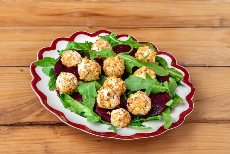 Burokėlių, fetos sūrio ir rukolos salotos – įspūdingos, neįprastos ir sveikos! Feta sūrio rutuliukai su riešutais puikiai dera su saldžiais burokėliais.