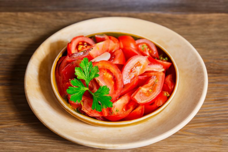 Nulupkite česnako skilteles. Pomidorus, žoleles ir česnaką nuplaukite šaltu vandeniu.