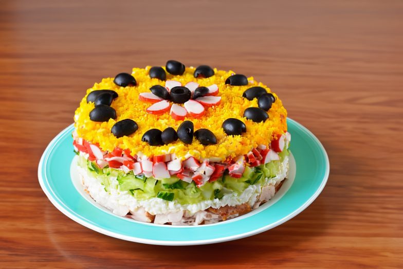 Greitos gimtadienio salotos – paprastas, skanus ir lengvai paruošiamas patiekalas! Rūkyta vištiena, krabų lazdeles, kiaušiniai ir agurkas – šventinė klasika.