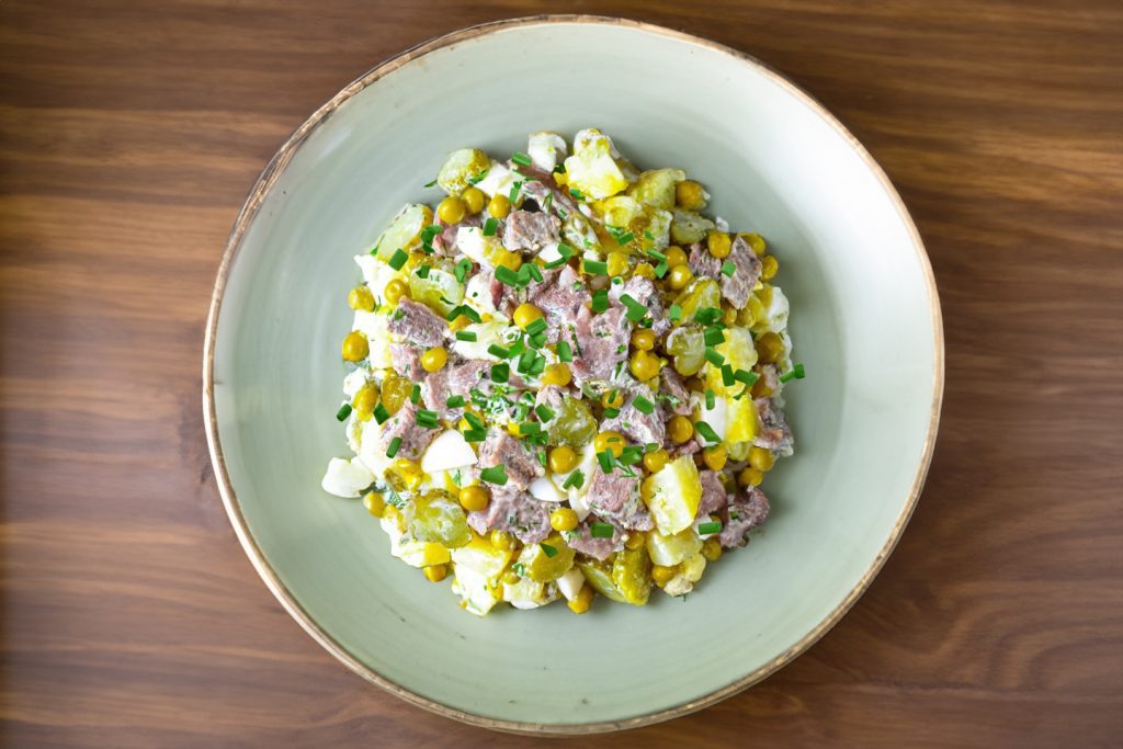 Jautienos salotos su raugintais agurkais – soti šventinė ar kasdieninė užkandėlė. Primena sovietinį Olivjė, tik su minkšta virta jautiena vietoje dešros.