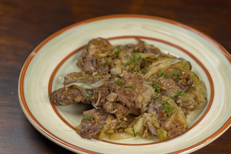 Kepta vištienos kepenėlė su svogūnais keptuvėje