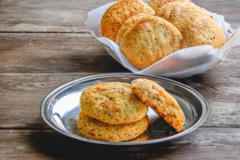 Kepimo skardą išklokite kepimo popieriumi ir išdėliokite rutuliukus, šiek tiek juos suplokite iki 4–5 mm storio.
