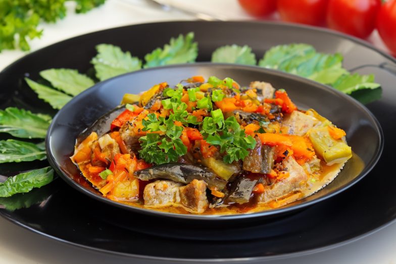 Paruoštą troškinį pabarstykite maltais pipirais ir šviežiomis žolelėmis (pagal norą). Galite patiekti! Skanaus!