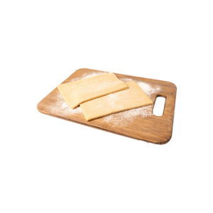 Atitirpintą tešlą dėkite ant miltais pabarstyto paviršiaus. Iškočiokite į ploną lakštą.