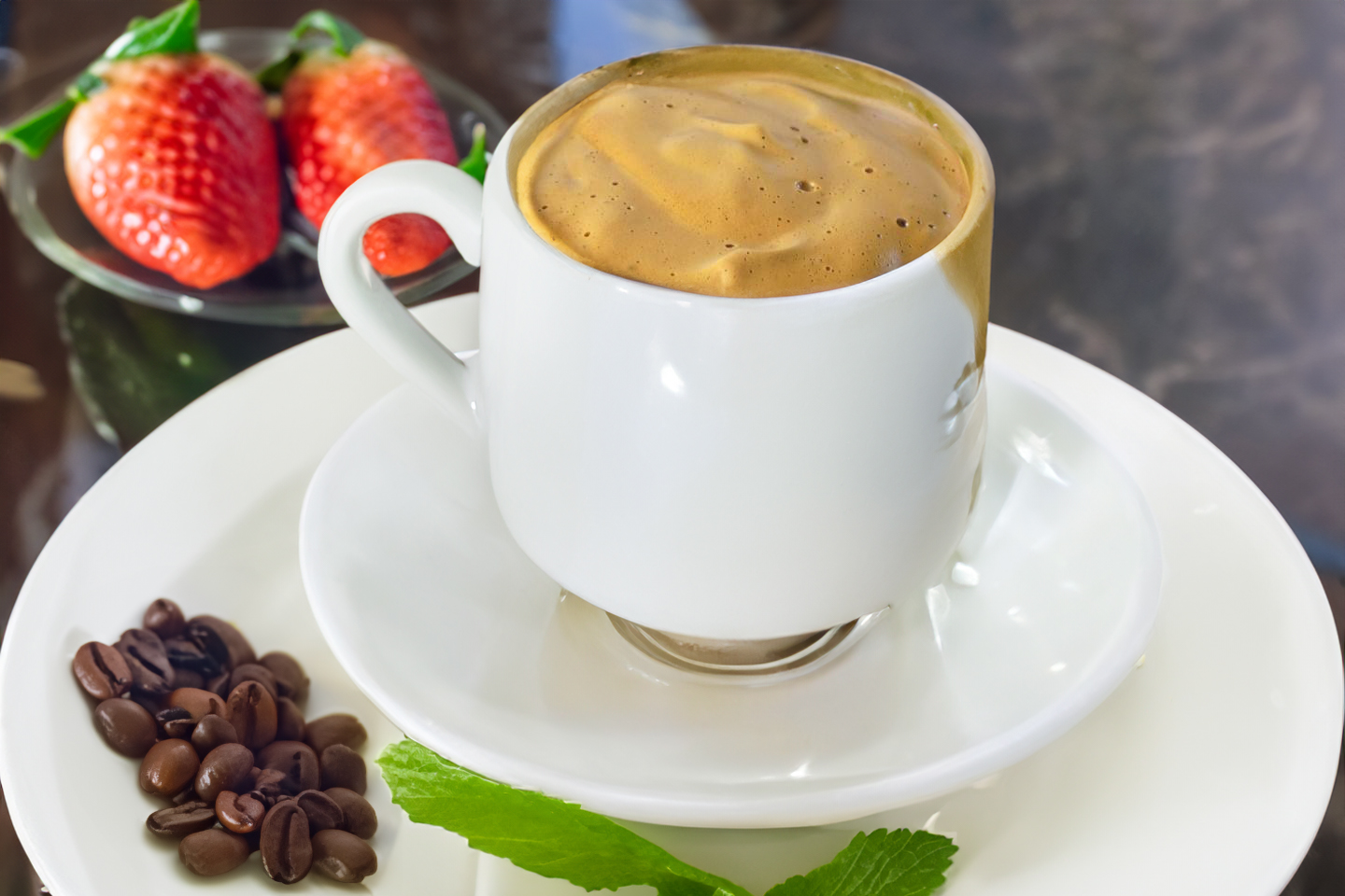 Inde sumaišykite kavą, cukrų ir verdantį vandenį. Plakite mikseriu, kol susidarys standi ir tiršta puta. Jei mikserio neturite, naudokite rankinį ar stacionarų blenderį. Jei neturite jokios technikos – plakite šluotele ar šakute. Nors puta bus ne tokia puri, skonis išliks puikus.