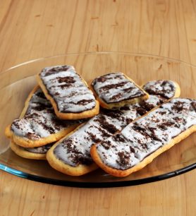 Sušalusius kokosų ruošinius iš visų pusių pamerkite į tirpintą šokoladą. Aš tai dariau dviem šakutėmis. Kai kas ruošinius veria ant medinių iešmelių, tačiau man ant iešmelių saldainiai sukinėjosi, todėl naudojau šakutes.