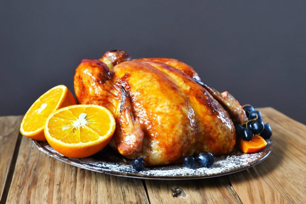 Orkaitėje kepta karamelizuota višta su auksine plutele – blizgi karamelinė plutelė ir saldžiai sūrus kvapas. Patiekite su vaisiais ir uogomis.