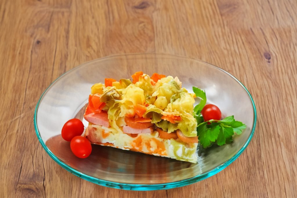 Orkaitėje keptas makaronų apkepas su dešrelėmis