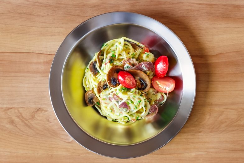 Pasta Carbonara su grybais, šonine ir grietinėle