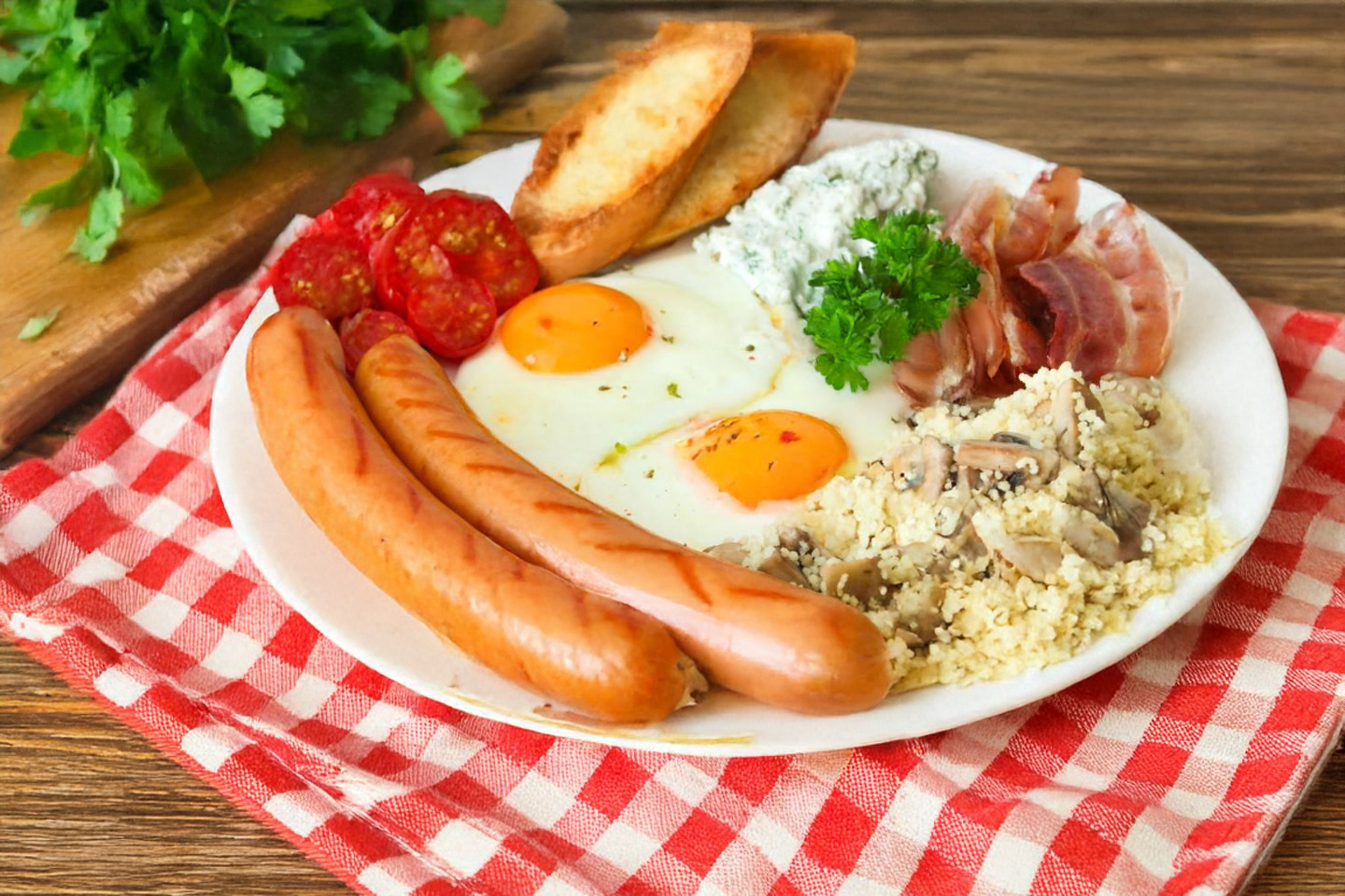 Pilni angliški pusryčiai – sotus patiekalas su kiaušiniais, dešrelėmis, šonine ir duona. Tobulas dienos pradžios pasirinkimas!