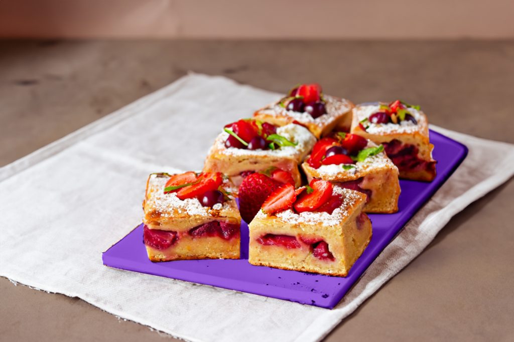 Pyragas iš pilno grūdo miltų – purus, gardus ir su švelniu karamelės poskoniu. Pagamintas iš dviejų rūšių miltų su sultingu braškių įdaru.