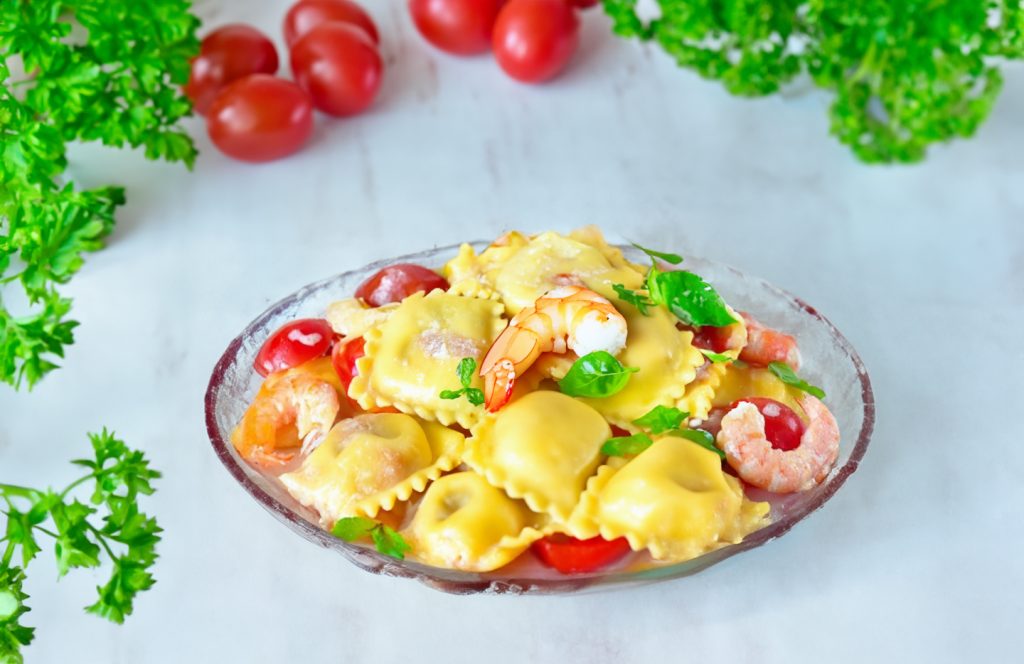 Ravioliai su krevetėmis – rafinuotas itališkas patiekalas, sužavės net išrankiausius. Su sūriu ir kremine padažo nata – tikras malonumas!