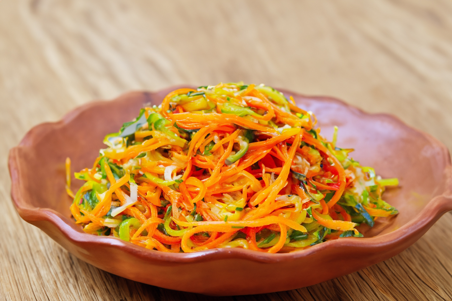 Morką ir cukiniją sutarkuokite korėjietiško stiliaus tarka arba supjaustykite plonomis ilgomis juostelėmis aštriu peiliu. Sudėkite į gilų dubenį.