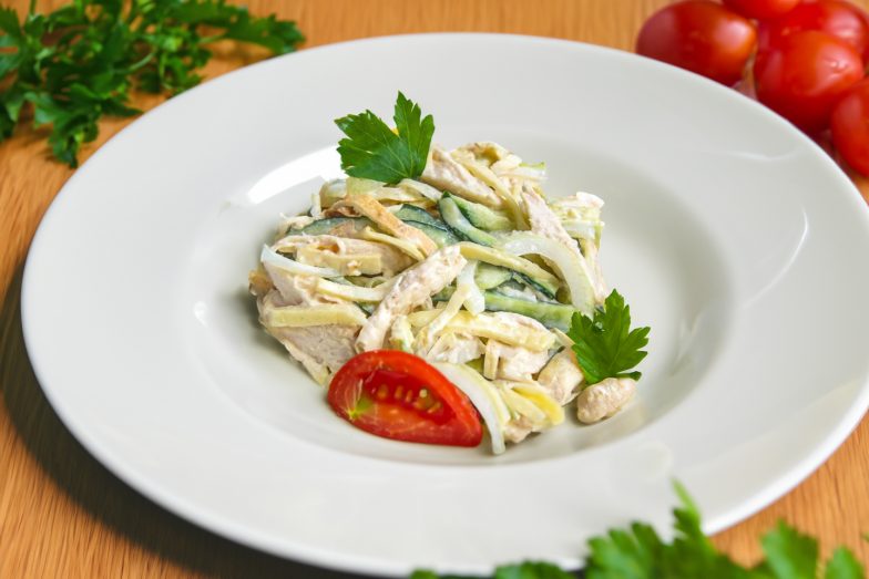 Salotos su kiaušinių blynukais ir agurkais – greitas ir sotus patiekalas. Puikiai tinka bet kurią dieną ar ypatingoms progoms, kai trūksta laiko.