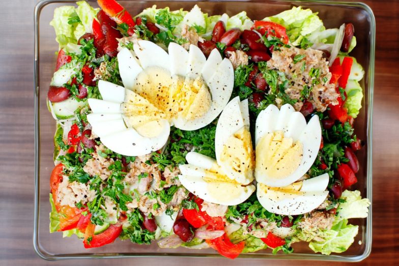 Salotos su konservuotu tunu ir pekininiu kopūstu: greitos, ryškios ir sočios – traškus kopūstas, daržovės, pupelės ir tunas. Tinka pietums ar vakarienei.