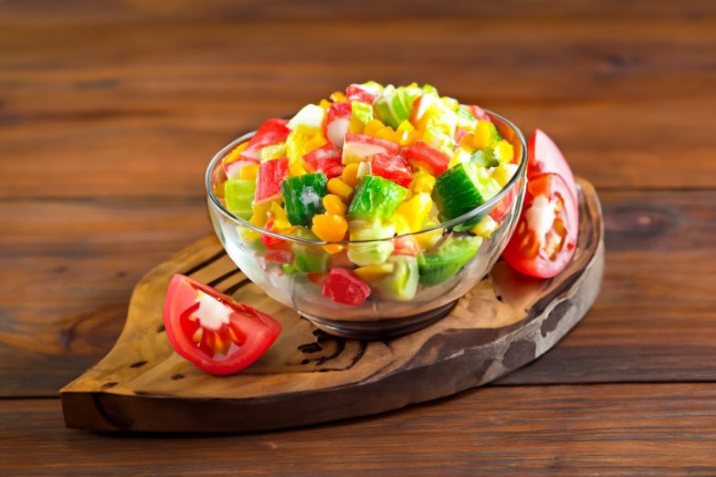 Salotos su krabų lazdelėmis ir šviežiu agurku