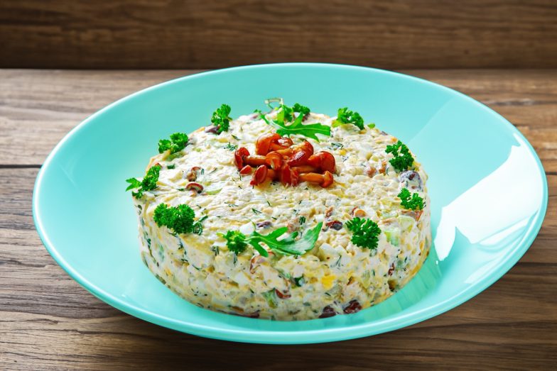 Iš anksto išvirkite vištienos filė ir bulves. Gerai nuplaukite kiaušinius, išvirkite kietai ir atvėsinkite šaltame vandenyje. Visi produktai turi būti atvėsinti, nes šiltas maistas greitai sugadins salotas.