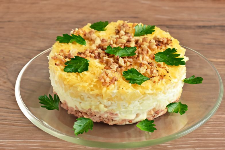 Sluoksniuotos salotos su vištiena, ananasais ir sūriu