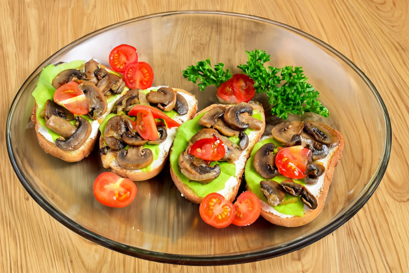 Ant viršaus sudėkite keptus pievagrybius. Sumuštiniai su pievagrybiais paruošti. Patiekite papuošę žalumynais arba vyšniniais pomidorais. Skanaus!