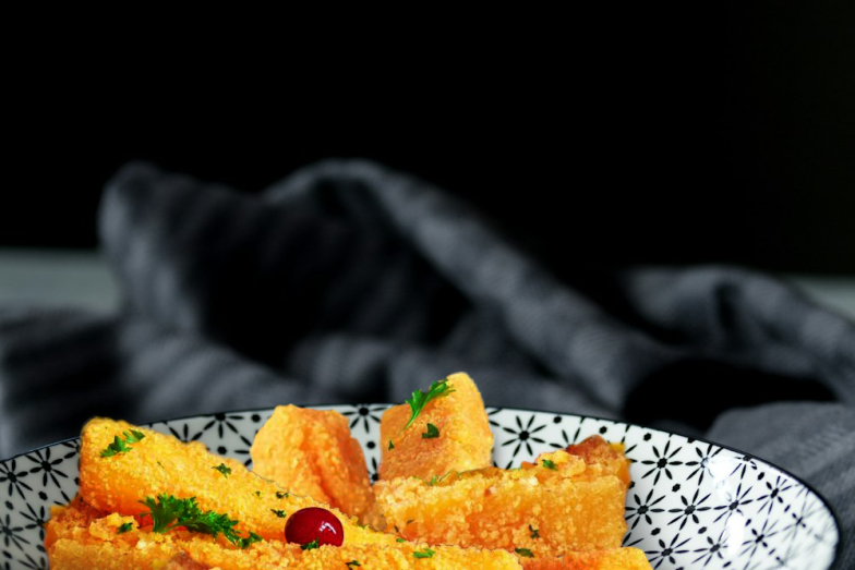 Kruopščiai apvoliokite džiūvėsiuose. Kad danga geriau priglustų ir būtų gražesnė, rinkitės stambesnius, gelsvus džiūvėsius su prieskoniais. Jei turite paprastus, įberkite paprikos, ciberžolės, druskos ir pipirų.