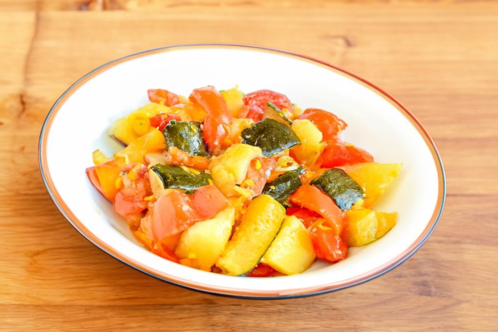 Kai bulvės ir cukinijos suminkštės, į keptuvę sudėkite pomidorus. Viską kartu patroškinkite dar 5–7 minutes ir nuimkite nuo ugnies. Aromatui įdėkite šiek tiek česnako.