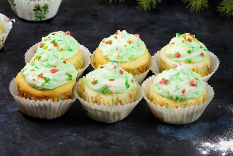 Įmaišykite maskarponę 2–3 dalimis. Jei norite – įdėkite maistinių dažų ir švelniai išmaišykite. Naudodami konditerinį maišelį ar švirkštą su antgaliu, papuoškite atvėsusius keksiukus. Galite papuošti valgomais perliukais ar pabarstukais. Skanaus!