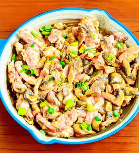 Nulupkite ir supjaustykite svogūną kubeliais.